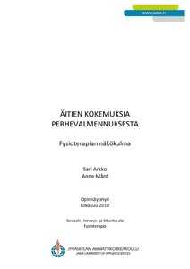 Opinnäytetyön tarkoitus oli tutkia, kuinka äidit kokivat fysioterapian aihealueet perhevalmennuksessa; oliko fysioterapian aihealueista hyötyä odotuksessa, synnytyksessä ja synnytyksen jälkeen sekä miten äidit kehittäisivät perhevalmennusta. Opinnäytetyön tavoite oli selvittää perhevalmennuksen kehittämistarvetta. Tutkimukseen osallistui kahdeksan äitiä (n=8). Tutkimus toteutettiin keväällä 2010 teemahaastatteluilla. Haastattelut litteroitiin ja analysoitiin sisällönanalyysillä. Suurin osa äideistä koki hyötyneensä perhevalmennuksesta. Sektiolla synnyttänyt ei kokenut hyötyneensä siitä. Perhevalmennuksesta saatiin uutta tietoa ja vertaistukea. Fysioterapian aihealueet