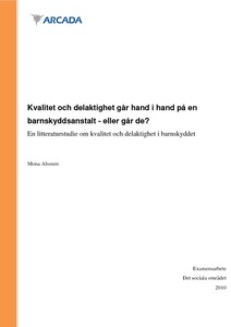 Syftet med detta examensarbete var att få fram vad som anses vara god kvalitet i vård utom hemmet och hur man kan få klienterna delaktiga i en god kvalitet på barnskyddsanstalter. Mitt examensarbete skall vara förkunskap och teorin till ungdomshemmet Tukkaris kvalitetshandbok som personalen på ungdomshemmet tillsammans kommer att konstruera under år 2011. För att fånga syftet ställdes två forskningsfrågor: Vad innebär god kvalitet på barnskyddsanstalter och hur kan man bedöma att det är bra kvalitet? samt Hur kan man få barn att känna att de är delaktiga, så att det leder till god kvalitet på en barnskyddsanstalt? Examensarbetet utfördes som en litteraturstudie där texterna baserade sig på litteratur och artiklar. Urvalskriterierna för litteraturen och artiklarna var att de skulle handla om det finländska barnskyddet och främst vara skrivna på 2000-talet. Artikelanalysen gjordes som en innehållsanalys där det bildades relevanta kategorier utgående från mina forskningsfrågor. I resultatet kom det fram att god kvalitet i vård utom hemmet innebär god vård, skötsel och fostran samt att vården skall beakta klienternas egna önskemål och förväntningar om barnskyddsservicen. Kvalitativt arbete ansågs vara ett klientcentrerat arbetssätt samt ett bra samarbete med barnets nätverk. Kvalitet kan bedömas med hjälp av riksomfattande kvalitetskriterier om vård utom hemmet eller genom att utvärdera kvaliteten på anstalten i efterhand. För att klienterna skall känna sig delaktiga i en god kvalitet i barnskyddet är det viktigt att klienterna får vara med och påverka i vardagen på anstalten. Genom att personalen hör och fäster uppmärksamhet vid barnens åsikter och önskemål får barnen en känsla av delaktighet. The purpose of this thesis was to obtain what is considered to be good quality in foster care and how to get clients participate in the quality of service at child welfare institu-tions. My thesis is intended to be taken into account and theory for the youth home Tuk-karis quality handbook that the staff at the youth home will develop during 2011. In order to capture the purpose two research questions were asked: What comprises good quality service at child welfare institution and how can we assess that there is good quality of service? and, How can you get children to feel participate in a good quality service at a child welfare institution? The work has been conducted as a study of literature based on books and articles. The selection criteria for the chosen literature and articles was that they should encompass the Finnish child welfare system and be written during the 21st century. The article analysis was performed as a content analysis which was arranged into relevant categories based on my research questions. The results show that good quality foster care means good care, conduct and rearing as well as taking into account the client´s own wishes and expectations of the child protection service. Qualitative work was seen as a client-centered approach and a good working relationship with the child´s network. Quality can be assessed by using national criteria of quality child welfare care or by evaluating the quality of service of the institution afterwards. For the clients to feel participate of a good quality service of child protection, it is important that clients may have an influence in everyday life at the institution. By paying attention to and listening to the child´s views, the children are given a sense of participate.