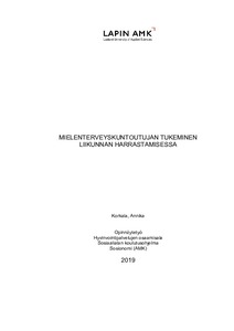 Opinnäytetyön tarkoituksena oli kartoittaa mielenterveyskuntoutujien kokemuksia heidän eri palveluissa saamastaan tuesta liikunnan harrastamiseen. Opinnäytetyön aineisto kerättiin kyselylomakkeilla keväällä 2019. Kyselyn kohderyhmänä olivat rovaniemeläiset mielenterveyskuntoutujat, ja kyselyä jaettiin kahdessa eri mielenterveyskuntoutujille palveluita tuottavassa kolmannen sektorin toimipisteessä kolmen viikon ajan. Tutkimuskysymykset olivat: 1) millaista tukea mielenterveyskuntoutuja on saanut liikunnan harrastamiseen; 2) millaista tukea kuntoutuja kaipaisi liikunnan harrastamiseen tällä hetkellä; ja 3) ovatko matalan kynnyksen liikuntamahdollisuudet vastanneet kuntoutujan tarpeisiin. Aineiston analyysissä käytettiin teemoittelua ja kvantifiointia.