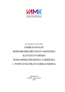 Opinnäytetyön tarkoituksena on tehdä havainnointitutkimus leikkaussalin leikkaussalihoitohenkilökunnan aseptisen toiminnan toteutumisesta 1. puhtausluokan leikkauksissa intraoperatiivisessa vaiheessa. Tutkimuksen tavoitteena on tuottaa tietoa Vaasan keskussairaalan leikkaus- ja anestesiaosaston leikkaussalihoitohenkilökunnan aseptisen käyttäytymisen toteutumisesta ja selvittää, mitkä aseptiikan osa-alueet toteutuvat hyvin ja missä osa-alueissa on puutteita. Työn tilaajana toimii Vaasan keskussairaalan leikkaus- ja anestesiaosasto. Havainnointitutkimus toteutettiin toukokuussa 2018, jolloin havainnoitiin yhteensä 20 leikkausta. Havainnoitavina oli yhteensä 80 perioperatiivista sairaanhoitajaa. Havainnoinnin osa-alueita oli yhteensä kuusi, joissa kaikissa oli useita alakohtia. Tutkimustulokset taulukoitiin ja prosentti- ja frekvenssijakaumat laskettiin.