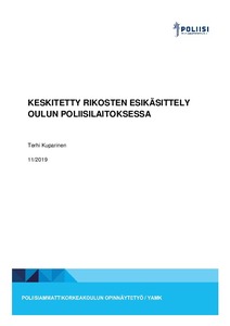 Opinnäytetyö käsittelee rikosten esikäsittelytoiminnon (REK) keskittämistä Oulun poliisilaitoksessa. Tutkimuksessa selvitetään, mitä vaikutuksia keskittämisellä on ollut rikostutkinnan toimintoihin ja Oulun poliisilaitoksen tuloksellisuuteen. Oulussa toimi rikosten esikäsittelyryhmä jo aikaisemmin, mutta keskittämisen jälkeen koko Oulun poliisilaitoksen alueen juttujen esikäsittelyprosessi on yhdenmukaistettu. Keskittämisen myötä REK:n henkilöstöresursseja lisättiin huomattavasti. Yhtenä poliisin strategian mukaisena toimenpiteenä rikollisuuden torjumiseksi on yhdenmukaisten käytäntöjen luominen esitutkintaan tulevien rikosasioiden esikäsittelystä juttujen priorisoimiseksi. Poliisilaitokset ovat luoneet rikosten esikäsittelyryhmiä vastatakseen strategian mukaiseen tavoitteeseen.