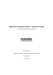 Tulokset osoittivat, että ikääntyvät pystyvät ehdottomasti oppimaan uutta. Oppimiskyky kuitenkin vaihtelee yksilöllisesti, samoin asenteet muutoksia kohtaan. Siksi työntekijät pitäisi arvioida yksilöllisesti ilman ikärasismia. Yritysjohdon pitäisi mahdollistaa digitalisoitumista matalan hierarkian, rajoja ylittävän yhteistyön, avoimen kommunikoinnin ja tiimiälyn avulla. The aim of this thesis was to examine digitalisation in small or medium-size companies with ageing employees. The purpose was to find out if the age of the employees is an obstacle to digitalisation or could other obstacles be found. There is a vast amount of ageing employees, and they have to be included in the digitalisation process.