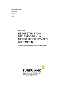 Opinnäytetyön tavoitteena oli kartoittaa pienmyymälän esimiesten työn mielekkyyden ja merkityksellisyyden kokemusta muuttuvassa toimintaympäristössä. Tavoitteena oli saada näkemyksiä, mitkä asiat vaikuttavat esimiesten työn mielekkyyden ja merkityksen kokemukseen. Mitkä asiat vähentävät ja mitkä lisäävät sitä? Tavoitteena oli myös selvittää voiko johtamisella vaikuttaa tähän.