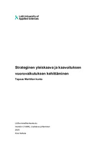 (2025)Opinnäytetyön tavoitteena oli kehittää monimenetelmällisen tapaustutkimuksen avulla kaavoituksen vuorovaikutusta sekä tutkia strategisen yleiskaavan mahdollisia hyötyjä Marttilan kunnassa. Työn teoreettisena viitekehyksenä ... -