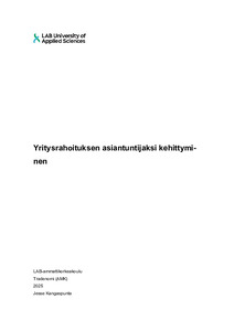 (2025)Opinnäytetyössä seurattiin yritysrahoituksen asiantuntijuuden kehittymistä. Työn tavoitteena oli antaa keinoja kehittää omaa ammatillista osaamista ja selvittää kuinka kehitys tukee työtehtävissä suoriutumista. Tarkasteltaviksi ... -