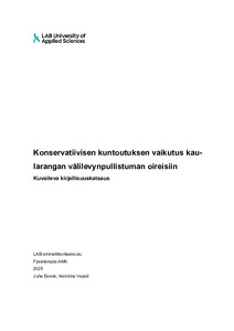(2025)Opinnäytetyön tavoitteena oli lisätä ajankohtaista tietoa fysioterapeuteille kaularangan välilevynpullistuman konservatiivisesta kuntoutuksesta. Tarkoituksena oli tarkastella konservatiivisen kuntoutuksen vaikutusta ... -