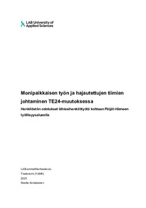 (2025)Tutkimuksessa tarkasteltiin lähiesihenkilötyöhön kohdistuvia odotuksia, toiveita ja pelkoja sekä lä-hiesihenkilötyön merkitystä TE24 -muutostilanteen sekä monipaikkaisen työn ja hajautettujen tii-mien näkökulmasta. TE24 ... -