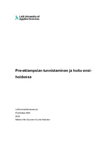 (2025)Opinnäytetyön aiheena on pre-eklampsian tunnistaminen ja hoito ensihoidossa. Pre-eklampsia on vakava raskauskomplikaatio, joka voi nopeasti uhata sekä äidin että sikiön terveyttä. Suomessa siihen sairastuu 2–3 % synnyttäjistä, ... -