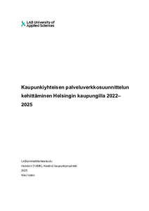 (2025)Tämä opinnäytetyö käsittelee kaupunkiyhteisen palveluverkkosuunnittelun kehittämistä Helsingin kaupungilla vuosina 2022–2025. Työn tavoitteena oli vahvistaa poikkihallinnollista yhteistyötä, kehittää palveluverkkosuunnittelun ... -
