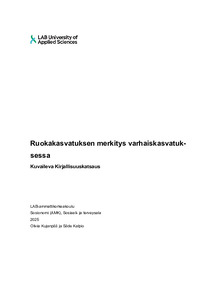 (2025)Ruokakasvatus on keskeinen osa varhaiskasvatuksen toteutusta ja pedagogiikkaa. Sen asemaa lasten oppimista ja hyvinvointia tukevana tekijänä on nostettu aktiivisesti esiin viimevuosina. Opinnäytetyön tavoitteena oli lisätä ... -
