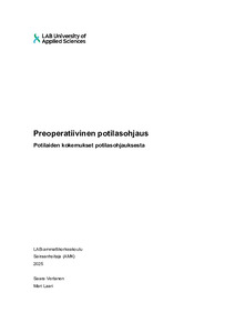 (2025)Preoperatiivisella eli ennen leikkausta tapahtuvalla potilasohjauksella on suuri merkitys operaation onnistumisen kannalta, etenkin jos potilas saapuu leikkaukseen suoraan kotoaan. Opinnäytetyön tarkoitus oli tutkia ... -