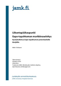 Tämä opinnäytetyö on tehty Jyväskylän kaupungin liikuntapalveluille tukemaan uuden tapahtuman rakentamista ja järjestämistä. Opinnäytetyön tavoitteena oli tehdä markkinaselvitys ensimmäistä kertaa järjestettävän Liikuntapääkaupunki Expo-tapahtuman potentiaalisilta kävijöiltä. Jyväskylä on brändännyt itsensä liikuntapääkaupungiksi, ja liikuntapääkaupunki on myös yksi neljästä Jyväskylän kaupungin 2017–2021 strategian kärjistä. Tämän