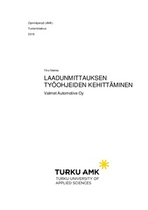 Opinnäytetyö tehtiin toimeksiantona Valmet Automotiven Uudenkaupungin kokoonpanotehtaan autojen loppukokoonpanon laadunmittaukselle. Tavoitteena oli kehittää laadunmittausasemien työohjeet käyttäjiltä saadun palautteen, asiakasvaateiden, ulkoisen auditoinnin ja sisäisen toimintaohjeiston mukaisiksi. Lisäksi tuotettu materiaali tarjoaa käyttäjille pohjan, jolle tuottaa tulevaisuudessa työohjeita muissa vastaavissa kohteissa.