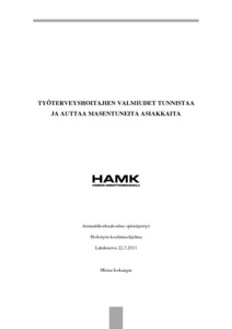 Tämän opinnäytetyön tarkoituksena oli selvittää millaisia valmiuksia työterveyshoitajat kokevat omaavansa masennuksen tunnistamiseen ja hoitamiseen. Aiheen valinta perustui omaan kiinnostukseen ja toisaalta aiheen ajankohtaisuuteen. Masennus on hyvin merkittävä terveysongelma etenkin työikäisillä. Masennusoireet ovat kuitenkin toisinaan vaikeasti tunnistettavissa. Masentunut kokee uupumusta, arvottomuuden tunnetta ja mielihyvän menetystä. Masennus aiheuttaa toimintakyvyn laskua, sairauspoissaoloja ja työkyvyttömyyttä. Työterveyshuollolla on keskeinen rooli masennuksen varhaisessa tunnistamisessa ja hoidossa.