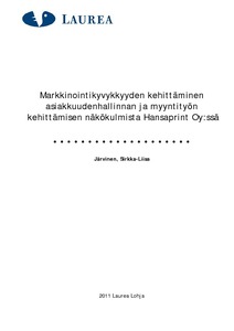 Tämän tutkimuksellisen kehittämishankkeen tarkoituksena oli selvittää, kuinka markkinointikyvykkyyttä voidaan kehittää asiakkuuden hallinnan ja myyntityön kehittämisen näkökulmista. Tutkimus liittyy laajempaan kokonaishankkeeseen ja tässä työssä rajauduttiin kuvaamaan myyntiprosessin mallintamista nykytilanteesta kehittämistarpeeseen. Työ suoritettiin toiminnallisena kehittämishankkeena. Toimeksiantajana ja taustaorganisaationa kehittämishankkeessa oli Hansaprint Oy. Työn päätavoitteena oli mallintaa myyntiprosessi ja löytää siitä kehittämistarpeita.