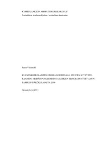 Opinnäytetyössä selvitettiin kuusankoskelaisten, omissa kodeissaan asuvien sotaveteraanien, heidän puolisoiden ja leskien elinolosuhteita avuntarpeen näkökulmasta. Tutkimuksessa kartoitettiin avuntarvetta päivittäisissä toiminnoissa, mistä apua saatiin ja millaisia palveluita arvioitiin tarvittavan tulevaisuudessa. Tutkimuksen teoriaosaan haettiin tietoa kirjallisuudesta, joka käsitteli elinolosuhteita, toimintakykyä ja avuntarvetta yleisesti ja iäkkäiden näkökulmasta. Tutkimuksen tuloksia verrattiin joihinkin Suomessa ja Ruotsissa tehtyihin vastaavanlaisiin tutkimuksiin.
