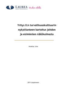 Tämä opinnäytetyö on tehty yritys X:n turvallisuusjohtamisen tueksi. Yrityksen turvallisuustavoitteet on kirjattu vuonna 2008 tehtyihin turvallisuuslinjauksiin, joihin tämä opinnäytetyö perustuu. Työssä tutkitaan yritys X:n johdon ja esimiesten turvallisuuskulttuurin kypsyystasoa sekä miten yrityksen turvallisuuslinjauksien jalkauttamisessa on onnistuttu. Tutkimuksen tarkoituksena on antaa kehitysehdotuksia yritys X:n turvallisuuden kehittämiseksi sekä nostaa turvallisuusasioita johdon ja esimiesten tietoisuuteen.