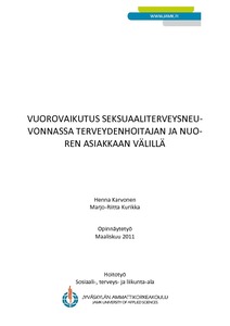 Tutkimuksessa kuvattiin millaista vuorovaikutus on terveydenhoitajan ja nuoren välillä seksuaaliterveysneuvonnassa, minkälaisia kohtaamisen työmenetelmiä terveydenhoitajilla on käytössä sekä terveydenhoitajan ja nuoren subjektiivisia kokemuksia vuorovaikutustilanteesta. Tavoitteena on kehittää terveydenhoitajan ja nuoren välistä vuorovaikutusta seksuaaliterveysneuvonnassa.