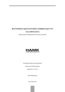Opinnäytteemme työmenetelmäksi valikoitui toiminnallinen opinnäytetyö, jonka tuotoksena valmistui ikääntyneiden ravitsemusta ja ravitsemushoitoa käsittelevä opetusmateriaali ikääntyneiden hoitotyön opintoihin. Hoitotyön koulutusohjelman opetussuunnitelman muuttuessa Hämeen ammattikorkeakoulussa 2011–2014 opinnäytetyömme tuotokselle tarjoutui ajankohtainen tarkoitus. Uskomme, että aiheen tunnetuksi tekeminen jo opintojen aikana siirtäisi ikääntyneiden ravitsemusta koskevan tiedon luontevasti käytännön hoitotyöhön.
