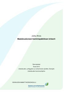 Tämä opinnäytetyö koostuu teoreettisesta viitekehysosuudesta, jossa käsitellään mm. sitä, mikä vaikuttaa maatalouskoneen ostopäätökseen sekä sitä, millä perusteella ihmiset yleensäkin tekevät ostopäätöksiä. Opinnäytetyön tutkimusosuudessa pyritään selvittämään puhelinhaastatteluna toteutettavalla survey-kyselyllä maanviljelijöiden ja urakoitsijoiden ostopäätöksiin vaikuttavia asioita. Opinnäytetyön lopussa esitetään teorian ja tutkimuksen perusteella tehdyt johtopäätökset koskien sitä alkuperäistä kysymystä, että millä perusteella syntyy maatalouskoneen ostopäätös.