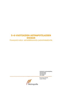 Opinnäytetyömme tarkoituksena oli tuottaa Jorvin sairaalan lastentautien poliklinikan www-sivuille 5–6-vuotiaille astmalapsille suunnattu ohjaus powerpoint-esityksenä, jossa lapsi tutustuu oikeaan lääkkeenottotekniikkaan ja inhalaattorivälineisiin omaan kehitykseensä sopivalla tasolla. Kyseisessä iässä juuri ennen koulun aloitusta, lapset alkavat harjoitella ja siirtyä inhalaattoreiden käyttöön lääkkeenotossa. Havainnollisen powerpoint-esityksen avulla olemme pyrkineet herättämään lapsen mielenkiinnon omaa astmahoitoa kohtaan ja samalla ohjaamaan lasta oikean lääkkeenottotekniikan oppimisessa jauheinhalaattorilla. Tuotetyömme perustuu tutkittuun tietoon ja monipuoliseen lähdeaineiston käyttöön 5−6-vuotiaiden lasten ohjauksessa.