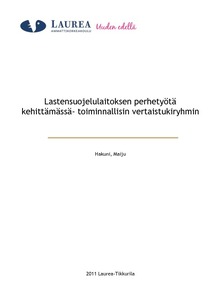 Ylemmän ammattikorkeakoulututkinnon opinnäytetyöni aihe oli kehittää Hyvinkäällä sijaitsevan lastensuojelulaitoksen perhetyötä. Huostaanotettujen lasten vanhemmat kokevat jäävänsä usein yksin huostaanoton jälkeen ja tarve lisätä ja kehittää perhetyötä nousi laitoksen lasten vanhemmilta. Myös työntekijät ja laitoksen esimies olivat kokeneet, että jos kyettäisiin avoimempaan, luottamuksellisempaan ja vuorovaikutuksellisempaan kontaktiin vanhempien kanssa, lasten etu toteutuisi paremmin ja yhteistyöstä tulisi hedelmällisempää ja vanhemmuutta tukevampaa. Vanhempien tarpeet ja toiveet pyrittiin jatkuvasti huomioimaan työtä kehitettäessä. Kehittäminen tapahtui toimintatutkimuksellisella otteella, jossa työntekijät osallistuivat aktiivisesti sykliseen kehittämiseen, jossa suuntaa muutettiin arviointien perusteella.