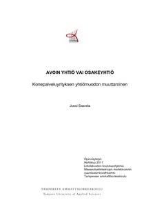 Tämän opinnäytetyön aiheena oli avoin yhtiö ja osakeyhtiö. Lisäksi tarkoituksena oli selvittää toimeksiantajalle, mitä avoimen yhtiön muuttaminen osakeyhtiöksi vaatii. Erityisesti työn tarkoituksena oli selvittää toimeksiantajalle, onko muutos ylipäätään järkevää toteuttaa, ja mitkä ovat muutoksen tuomat edut sekä haitat. Työn ajatuksena oli myös saada toimeksiantajalle eräänlainen käsikirja yhtiömuodonmuutoksesta.