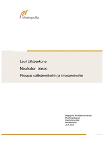 Opinnäytetyöni käsittelee nauhatonta bassoa. Sen teososa on nimeltään ”Nauhaton basso. Pikaopas soittotekniikoihin ja ilmaisukeinoihin”. Opas on kattava paketti, joka sisältää perustietoa nauhattomasta bassosta sekä harjoituksia, jotka auttavat kehittämään soittotekniikkaa ja ilmaisukeinoja. Ilmaisukeinoja käsitellään tunnettujen musiikkiesimerkkien kautta, jotta opiskelija ymmärtää miten ammattisoittajat ne toteuttavat. Musiikkiesimerkeistä on transkriptiot ja ne löytyvät myös audiomuodossa liitteenä olevalta cd-levyltä. Hyvin tärkeä osa opasta on myös sen viimeinen kappale, jossa esittelen kiinnostavia ja tutustumisenarvoisia kirjoja, levyjä ja kappaleita. Oppaan sisältämät harjoitukset koostuvat omasta harjoittelumateriaalistani vuosilta 2005–2011. Aloittaessani nauhattoman basson soiton vuonna 2005 minulla oli pulaa hyvistä harjoitusoppaista ja esimerkkilevytyksistä. Olen viimeisen kuuden vuoden aikana kerännyt paljon tietoa hyvistä levyistä ja soittajista ja lukenut monia englanninkielisiä oppaita. Tein oppaan, jotta joku toinen voisi päästä tiedonhausta vähemmällä vaivalla. Mielestäni oli myös hyvin tärkeää saada suomenkielinen opas nauhattomalle bassolle. Opinnäytetyön raporttiosa toimii opasta täsmentävänä osana. Se on opettajan opas, jossa harjoitukset käydään syvällisemmin läpi ja annetaan ohjeita niiden opettamiseen ja oikeanlaiseen suorittamiseen. Raporttiosassa käsitellään myös opinnäytetyöni tekoprosessia ja sen tarpeellisuutta sekä kohtaamiani pedagogisia haasteita. Haluan laajentaa opasta, ja mahdollisesti vielä julkaista sen, jotta se olisi helpommin kaikkien saatavilla. Aion testata opasta pitämilläni oppitunneilla ja tarjoan sitä muillekin opettajille saadakseni kehitysideoita ja -ehdotuksia tulevaisuuden varalle.