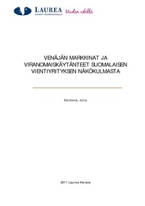 Tämän opinnäytetyön tarkoituksena oli käsitellä Venäjän markkinatilannetta, viranomaiskäytänteitä, tarvittavia asiakirjoja sekä yrityksen rekisteröimistä Venäjällä. Vaikka kyseessä onkin naapurimaa, on liikemaailma Suomessa ja Venäjällä hyvin erilainen. Suomi noudattaa EU:n asettamaa ulkomaankaupanlakia kun taas Venäjä noudattaa Venäjän Federaation laatimaa ulkomaankaupan lainsäädäntöä.