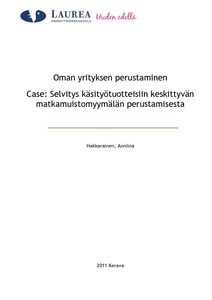 Opinnäytetyön tarkoituksena oli luoda kattava teoriapohja käsityöalan yrityksen perustamisesta. Yritys on suunnattu erityisesti matkailijoille, joten aihetta pyrittiin käsittelemään matkailullisesta näkökulmasta. Opinnäytetyön aihe syntyi tekijän omasta tarpeesta ja lopputuloksena syntyneen selvityksen ensisijaisena tarkoituksena on toimia tietolähteenä hänelle itselleen yrityksen perustamisen tullessa ajankohtaiseksi. Perustettava yritys on käsityötuotteisiin keskittyvä matkamuistomyymälä, jonka pääasiallinen asiakaskunta koostuu niin koti- kuin ulkomaisista matkailijoista.