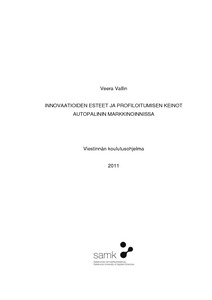Tämän opinnäytetyön aiheena olivat innovaatioiden esteet ja profiloitumisen keinot AutoPalinin markkinoinnissa. Työssä tutkittiin ja analysoitiin Satakunnan suurimman autotalon AutoPalinin uusien autojen sanomalehtimainontaa ja selvitettiin ilmoi-tusten sisältöön rajoittavasti vaikuttavia tekijöitä. Tavoitteena oli selittää automainonnan samankaltaisuuden aiheuttajia ja etsiä keinoja jälleenmyyjän parempaan profiloitumiseen painetussa mediassa.