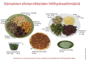 Tämän toiminnallisen opinnäytetyön tarkoituksena on tuottaa monipuolinen, selkeä ja konk-reettisista esimerkeistä muodostuva kuvamateriaali sekä ohjauksen tueksi terveyden- ja ruo-kahuollon ammattilaisille, että jaettavaksi maahanmuuttajalle mukaan. Materiaalin tarkoituksena on antaa potilaalle sellaista ruokavalio-ohjausta, jossa on huomioitu hänen tarpeitaan ja kulttuuriin liittyviä erityispiirteitä. Kuvamateriaaliin on kerätty ne ruoka-aineet, jotka kuuluvat maahanmuuttajien ruokavalioon, mutta ovat vieraita suomalaiselle ruokakulttuurille. Kuvamateriaali antaa tietoa ruoka-aineiden hiilihydraattiarvoista, joka on olennainen tieto tyypin 1 diabeetikon hoidossa.