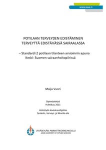 Opinnäytetyön aiheena oli standardi 2, joka sisältää laatutavoitteet potilaan tilanteen ja terveyden edistämisen tarpeen arvioimiseen. Tarkoituksena oli tutkia, kuinka hyvin laatutavoitteet ovat toteutuneet sairaanhoitopiirin eri vastuualueilla, sekä terveyttä edistävän aineiston että terveyttä edistävän kirjaamisen osalta. Tutkimuksen tavoitteena olivat konkreettiset kehittämisehdotukset siitä, minkälainen terveysaineisto edesauttaa potilaan terveyden edistämisen tunnistamista ja miten aineisto on paremmin potilaan saatavilla. Kirjaamiseen liittyvät kehittämisehdotukset koskivat parempaa tulotilanteen kirjaamista sekä terveyden edistämisen kirjaamisen jatkuvuutta. Tutkimusaineisto oli valmiiksi kerätty Jyväskylän ammattikorkeakoulun opiskelijoiden toimesta. Opiskelijat tutustuivat ammattitaitoa edistävässä harjoittelussaan yksikkönsä muutaman potilaan potilasasia-kirjoihin ja vastasivat niiden pohjalta sähköiseen kyselyyn. Kyselyaineisto analysoitiin yhdistäen laadullinen ja määrällinen tutkimusmenetelmä.