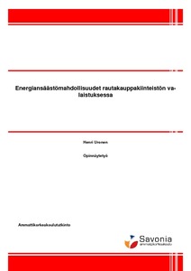Työssä esitellään tutkimuskohteena ollut rautakauppakiinteistö ja sen valaistus. Valaistuksesta käydään läpi siihen suunnitellut ohjaukset, käyttöajat ja energiankulutus. Tutkitut energiansäästö-mahdollisuudet käydään läpi ja niistä esitellään laskelmia vuositasolla. Ajatuksena oli selvittää millaisia säästöjä tutkittavan kohteen valaistuksesta on mahdollista saada ja mitä tulevien kohteiden suunnittelussa kannattaa ottaa huomioon.