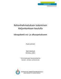 Opinnäytetyö toteutettiin yhteistyössä Keljonkankaan koulun kanssa. Työn tavoitteena oli tuottaa yhteistyökoulun alkuopetukseen soveltuva ideapaketti, joka koostuu kehonhahmotusta tukevista leikeistä. Ideapaketti koottiin kehohahmotuksen teoriatietoon pohjaten, korostaen kehonhahmo-tuksen merkitystä koulussa selviytymisten taitoihin. Näiden tietojen pohjalta muodostui ideapaketti, jonka kaikki leikit analysoitiin kehonhahmotuksen näkökulmasta (jokaisen leikin kohdalla kuvataan, miten lapsen tulisi leikistä suoriutua kehonhahmotuksen osalta). Lisäksi ideapakettia koottaessa pyrittiin huomioimaan sen helppokäyttöisyys osana koulun arkea.