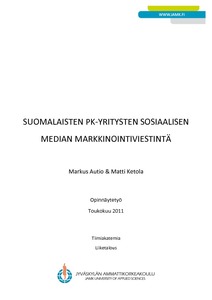 Työ käsittelee suomalaisten pk-yritysten sosiaalisen median käyttöä niiden markkinointiviestinnässä. Tutkimuksen tarkoituksena oli selvittää, kuinka suuri osa kohderyhmään kuuluvista yrityksistä käyttää markkinointiviestinnässään sosiaalista mediaa ja miten sitä käyttäneiden yritysten yrittäjät tai markkinointipäättäjät ovat markkinointiviestinnän yrityksissä kokeneet. Lisäksi tarkoituksenamme oli selvittää, oliko sosiaalisen median toimenpiteillä ollut vaikutusta yritysten tulokseen. Tutkimus toteutettiin joulukuussa 2010 verkkokyselynä Digium-ohjelmalla, johon saimme 271 vastausta. Kysely lähetettiin 5000 suomalaiselle pk-kategoriaan luettavalle yritykselle.