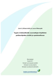 Opinnäytetyön tarkoituksena oli kuvata tyypin 2 diabetespotilaille suunnattujen kirjallisten ohjeiden sisältöä ja opetuksellisuutta. Tavoitteena oli tuottaa kirjallisista potilasohjeista tietoa, jota hoitohenkilökunta voi käyttää kehittäessään diabetespotilaiden ohjausta.