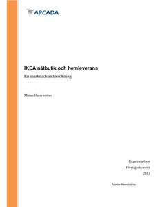 Konkurrensen på marknaderna blir ständigt hårdare. Internet och nät handel har medfört möjligheten att nå kunder dygnet runt och nästan helt utan geografiska begränsningar. För att företaget skall klara av konkurrensen måste deras produkter och tjänster tillfredsställa de alltmer krävande kundernas behov. För att tillfredsställa kundernas behov måste företagen undersöka vad kunderna efterfrågar och om företaget möter dessa krav. I detta arbete beskrivs hur en marknadsundersökning för IKEA nätbutiken kan se ut. Eftersom IKEA inte själv sköter om transporten till kunden, beskrivs grunder till utloka-lisering och vad målet med utlokalisering är. Eftersom användning av internet och nätbutiker ökar ständigt, undersöks orsakerna till deras framgång och vilka faktorer som styr kunderna vid val av nätbutiker. Undersökningens syfte är att samla in data om kundernas åsikter om IKEA nätbutiken och hemleveranser eftersom denna information inte finns från tidigare. Arbetet är gjort på uppdrag av IKEA Oy. Arbetets empiri del består av en kvantitativ undersökning som utförs med hjälp av en web enkät. Enkätens resultat tyder på att IKEA nätbutiken är användarvänlig och hemleveranserna fungerar bra, bortsett från vissa postnummerområden. Leveranstiden och fel leveranser är delområden som kräver arbete. Resultatet visar dock att respondenterna är färdiga att rekommendera IKEA nätbutiken åt sina bekanta vilket är mycket betydande vid val av nätbutik. The competition on markets is steadily changing and becoming more severe. Internet has provided companies the ability to reach customers night or day and with practically no geographical boundaries. To survive in this competitive atmosphere, companies have to offer products and service that meet the requirements of their customers ever growing demands. This thesis describes the making of a market research of the IKEA online store. As IKEA has outsourced the home delivery to its customers, the process of outsourcing and the requirements for a successful partnership is described. As eCommerce grows as a phenomenon, the reasons for the success and choice of online stores are studied more closely. The main aim for this thesis is to provide information about the IKEA online store and home deliveries from its customers to the managers whom it concerns since this information has not been previously available. The thesis is appointed by IKEA Oy. The work is done as a quantitative study and carried out by a web survey. Results of the survey reveal that the IKEA online store is user friendly and that in most cases the home deliveries are carried out according to agreement. Lead times and failed deliveries are still a concern and require work. In conclusion, the survey suggests that the customers are satisfied since they are willing to recommend the IKEA online store to other users.