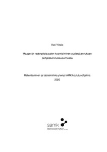 Säteilyturvakeskuksen suorittamien sisäilman radonpitoisuuden mittaustuloksia Porin ja Satakunnan alueella on vielä vähän ja harvakseltaan, joten niiden perusteella ei voida täysin selvittää yksittäisen rakennuspaikan radonpitoisuutta. Radonia esiintyy kuitenkin maaperässä joka paikassa aina jossain määrin. Ainoa tapa siis selvittää rakennuspaikan radonpitoisuus on mitata se maaperästä ennen rakentamista. Mikäli radonpitoisuutta ei mitata suoraan maaperästä, hyvä ratkaisu uudisrakennuksien sisäilman radonpitoisuuden torjumiseksi saattaisi olla, että rakennuspaikasta riippumatta kaikkiin uudisrakennuksiin, jotka tulevat olemaan asuin- tai työkäytössä, tehtäisiin huolelliset perustusten tiivistykset sekä rakennuspohjaan asennettaisiin vapaasti tuulettuva radonputkisto, etenkin maanvaraisella laatalla perustettaviin rakennuksiin. Uudisrakennuksen pohjarakennuslausunnon laatimisvaiheessa ei aina ole tiedossa rakennettavan rakennuksen perustustyyppiä, jolloin perustustyypin perusteella on vaikea määritellä tietynlaisen radonsuojauksen tarpeellisuus. Esimerkiksi tuulettuvalla alapohjalla, tai reunavahvistetulla laatalla varustetun rakennuksen radonsuojauksessa jo pelkästään rakenteiden huolellinen tiivistäminen koneellisen tulo- ja poistoilmanvaihdon kanssa saattaisi olla jo riittävä suojaus radonriskien torjumiseen. The aim of the thesis was to resolve how the radon concentration of soil is observed in the statement of foundation engineering of a new building. Long-term exposure to radon in the building’s indoor air causes the risk of lung cancer and therefore radon should be observed as early as possible in the construction process. In addition, different norms and rules require that radon is observed in design and construction of a building. The second purpose of the thesis was to develop a possible business within the sector of soil radon measurement.