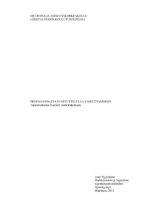 Tässä työssä käsiteltiin vaikuttamisviestinnän muodoista propagandaa ja suostuttelua, joista pääasiassa keskitytään propagandan tutkimiseen. Työssä käsiteltiin propagandaa epäeettisempänä ja suostuttelua eettisempänä vaikuttamisviestintänä. Propagandan ilmenemistä käytiin läpi sen modernista historiasta nykypäivään asti monissa eri muodoissa, jotta sitä voidaan tunnistaa käytännössä nykyään. Varsinaisessa tutkimusosuudessa tutkittiin propagandan ilmenemistä Suomen vaalirahakohussa vuosien 2008–2010 aikana.
