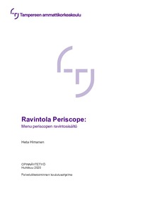 Opinnäytetyön tavoitteena oli selvittää ravintola Periscopen kuuden ruokalajin menu periscopen energiaravintosisältö ja sen sisältämä suolan määrä. Opinnäytetyön tarkoituksena oli dokumentoida ja saada tietoa ravintolaruoan ravitsemuksellisesta laadusta. Tutkimuskysymyksenä on: millainen menu periscope energiaravintoainejakaumaltaan ja suolan määrältään? Työn avulla toimeksiantajayritys sai lisätietoa tarjoamansa ruoan ravitsemuksellisesta sisällöstä.