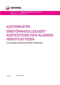 Opinnäytetyön tarkoituksena oli tarkastella ja kehittää Mikkelin Huoltotiimi Oy:n ajankäyttöä liukkaudentorjunnassa. Tarkastelun kohteina olivat pihat ja jalkakäytävät. Tavoitteena oli löytää mahdollisimman tehokas tapa suoriutua nykyisellä kalustolla hiekoituksesta ja löytää järkevää vertailutietoa, jonka perusteella tulevia kalustoinvestointeja voitaisiin suunnitella.
