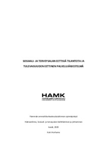 This final work was carried out in cooperation with the SotePeda 24/7 project funded by Finland’s Ministry of Education and Culture. The purpose of the study was to describe the key ethical situations in the social and health care sector. A further aim was to describe the participants views regarding the ethical service system of the future in the social and health care sector. The study was carried out as a qualitative study. The research material consists of the workshop work of the SotePeda 24/7 project. The project organized a total of six Future Work and Ethical Competence workshops, from which material has been collected for research from three workshops. A total of 132 working life professionals participated in the project. In addition, the workshops were attended by students and citizens in the field. The research material is comprised of discussions recorded In the course of the workshop’s work. The material was then analyzed inductively using the content analysis method.
