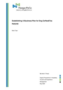 The objective of this thesis is to establish a feasible business plan for opening Dog Cof-fee&Tea shop in Helsinki. Dog Coffee&Tea is a dog-themed café where customers can bring their own dogs as well as spend time playing with lovely dogs while enjoying beverages. Dog Coffee&Tea serves different kinds of coffee, tea, and other drinks as well as desserts, sandwiches, and other delights. The cafe is expected to open in Helsinki's central area with a capacity of 50 to 70 seats. The estimated total area for the premise is approximately 80 square meters.