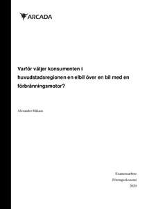 Detta examensarbete handlar om vilka orsaker och faktorer som inverkar på en konsuments beteende när den gör valet mellan elbil eller bil med förbränningsmotor. Syftet med studien är att undersöka och komma fram till vilka faktorer som driver konsumenten till att köpa en elbil istället för en bil med förbränningsmotor. Studien har avgränsats till huvudstadsregionen i Finland. Studien undersöker huruvida de ekonomiska eller miljörelaterade aspekterna väger tyngst, eller om även de psykologiska eller sociala aspekterna också har en stor betydelse.