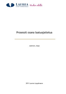 Tämä työ käsittelee, kuinka prosessit, niiden kuvaaminen, parantaminen ja mittaaminen ovat olennainen osa laatutyötä ja mitä haasteita siihen liittyy. Kun organisaatioon aletaan rakentaa laatujärjestelmää, tarvitaan menestyksellistä muutosjohtajuutta onnistuakseen tavoitteessa. Työn tavoitteena on selvittää, miten RAY:n Rahapelitoiminnan johto ja asiantuntijat näkevät laatuun, prosessien kuvaamiseen, parantamiseen, mittaamiseen ja muutosjohtamiseen liittyvät tarpeet.