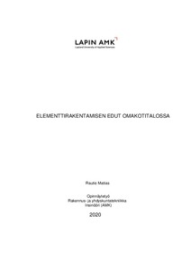 Opinnäytetyön tarkoituksena oli vertailla paikalleen rakennetun puurunkoisen omakotitalon ja vastaavan omakotitalon, mutta elementtitekniikalla toteutetun eroja. Tavoitteena oli osoittaa elementtirakentaminen tehokkaammaksi, halvemmaksi, turvallisemmaksi sekä kosteuden hallinnan puolesta järkevämmäksi tekniikaksi. Ongelmaksi muodostui kirjallisen tiedon ja käytännön osoittaman tiedon yhdistäminen ja luotettava vertailu. Paikalleen rakennetun talon tuntimenekkilaskelmissa käytettiin Ratu-kortiston antamia arvoja ja elementtirakentamisessa esimerkkikohteeni toteutuneita menekkejä.