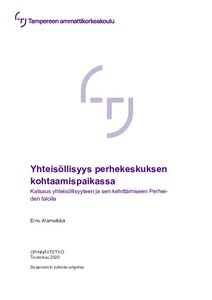 Opinnäytetyön tarkoituksena oli selvittää perhekeskuksen kohtaamispaikan kävijöiden kokemuksia yhteisöllisyyden toteutumisesta ja kehittämisestä kohtaamispaikassa. Opinnäytetyössä tuotettiin tutkimuksen kuvaamiseen ja tiivistämiseen tarkoitettu juliste, joka toimitetaan tutkimuspaikkana toimineelle Perheiden talolle. Opinnäytetyön tutkimus toteutettiin pirkanmaalaisen asumiskeskuksen perhekeskuksen kohtaamispaikkana toimivalla Perheiden talolla.