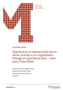 Opinnäytetyössä sukelletaan sisäisen auditoinnin ja kontrollien maailmaan. Tutkimuskysymyksenä olivat 1. ”Miten sisäiset auditoinnit sekä kontrollisysteemit ovat yrityksessä toteutettu?”, sekä 2. ”Miten tehokkaasti edellä mainitut tukevat yrityksen liiketoimintaa?”. Tutkimusaihetta lähestytään operationaalisesta näkökulmasta. Työssä seurataan keskeisten teemojen toteutumista kansainvälisessä logistiikkayrityksessä, ja kirjallisuuslähteet tukevat tutkimuskysymyksiin vastaamista.
