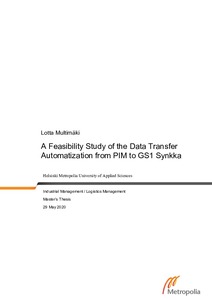 The objective of this study was to provide a feasible solution proposal for automating the data transfer between the case company’s PIM system and GS1 Synkka since there currently is no solution for this, but the market potential has been recognized.